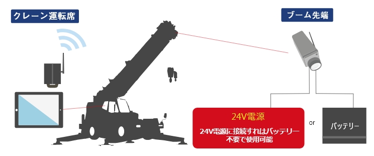 クレーンのブーム先端に取付け、真下を映しだし送信する『カメラユニット』、この『カメラユニット』に電源を供給する『バッテリーユニット』、運転席内にてオペレーターが映像を見るための『モニターユニット』の3部で構成されており、この映像は無線方式でブーム先端から運転席内に送受信されるため、油圧伸縮式のブームを持つクレーンにも面倒な配線処理無しでセッティングが可能です。